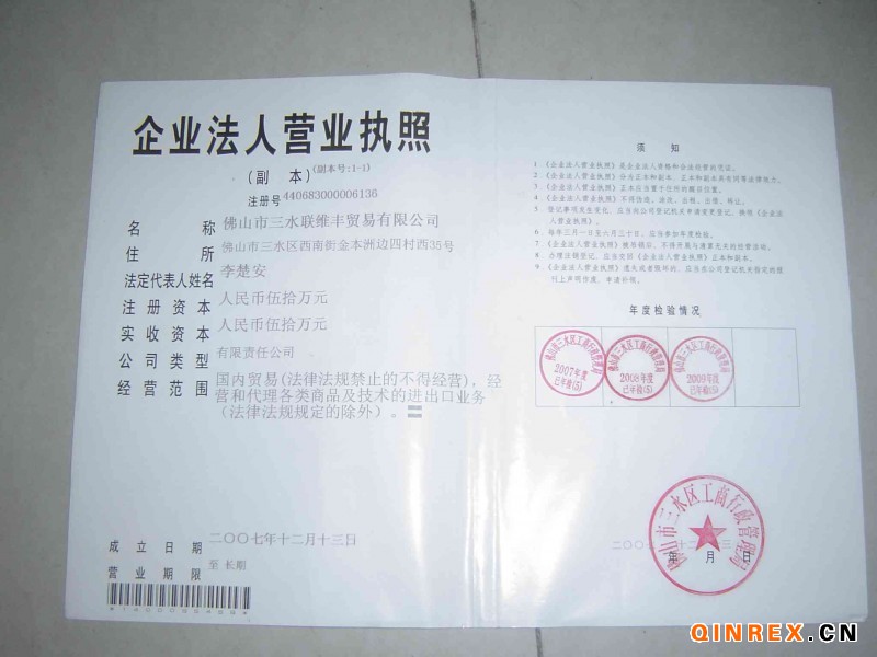 | 發(fā)證機(jī)構(gòu): | 佛山市三水區(qū)工商行政管理局 | 發(fā)證時(shí)間 : | 2007-12-13 |