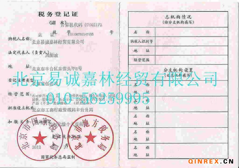 北京易誠嘉林經貿有限公司稅務登記證