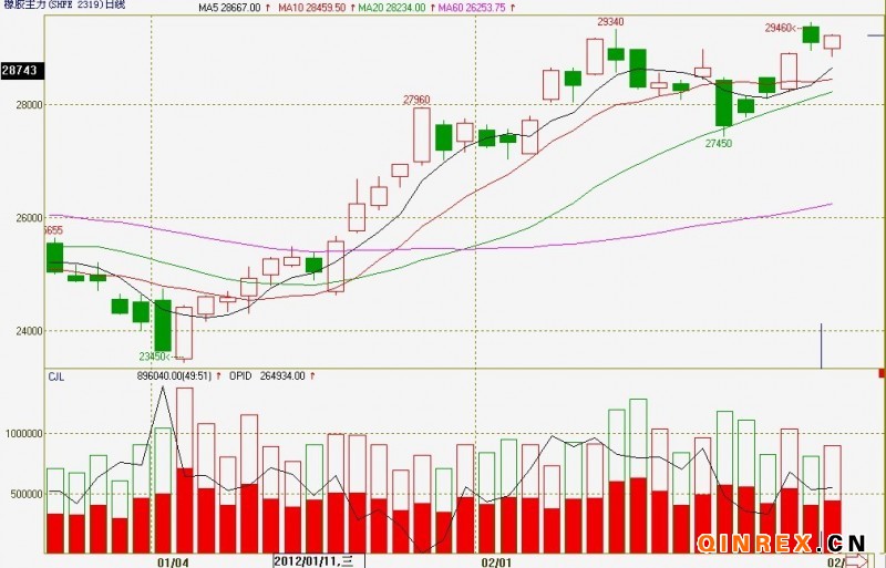 年前在歐債危機逐漸得到解決的以及泰國聲稱要收儲三號煙片膠的支撐下,天膠從底部23450元/噸拔地而起,但從2月6日開始,天膠就陷入強勢震蕩之中,上下兩難。