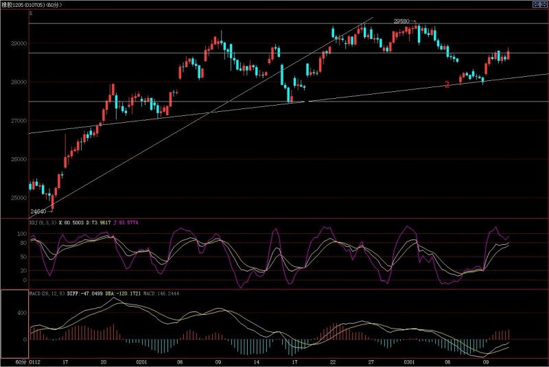 天膠價格在前期的箱體震蕩(28750—29500)的下方,價格走勢受到區間28750—29000的壓制。并且通過KDJ指標,可以看出,當前價格接近超買區間,此次從28000開始的反彈,其后市動能略顯不足,因此反彈的上方空間不做過大預期,所以在前期高點29500,存在很大的壓力。