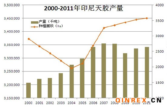 2011年,印尼天然橡膠產量264萬噸,同比增長2%;其中私人產量增加4萬噸,政府增加7600噸,莊園增加1600噸。