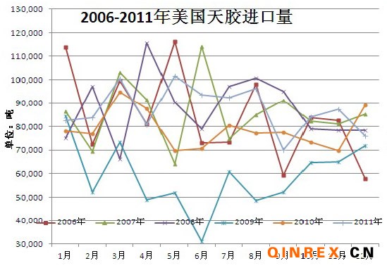 2011年美國(guó)天然橡膠進(jìn)口量105萬(wàn)噸,同比增長(zhǎng)11%,已恢復(fù)到06、07年的進(jìn)口量的正常水平。