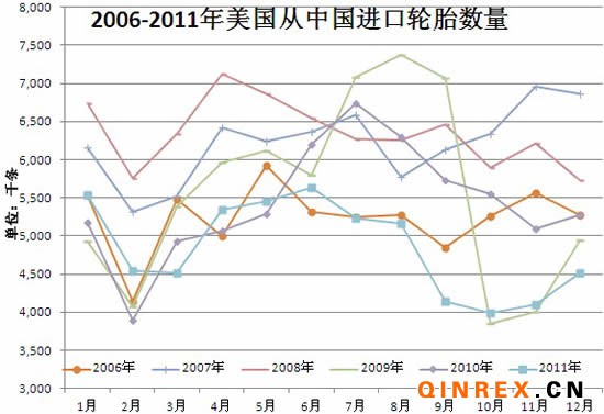 2011年,美國共進口輪胎196011千條,同比微增0.55%。從上圖可以看出進口量與2007年(2007年進口量為2000年以來最高)相差無幾。