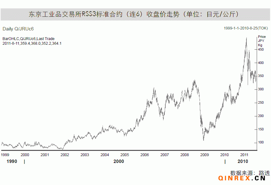 近幾年由于全球經濟的動蕩,匯率變動頻繁,對天然橡膠價格,尤其進出口業務有一定的影響。因此,在關注國際市場天然橡膠行情的時候,一定要關注 各 國尤其是三大產膠國以及日元兌美元的匯率變動情況。有資料表明,通過相關性 分析,日元對美元匯率與TOCOM天然橡膠價格存在一定的相關關系,因此,日元兌美元匯率的變動對進口天然橡膠的成本會產生相應影響,從而引起國內膠價的 變動。