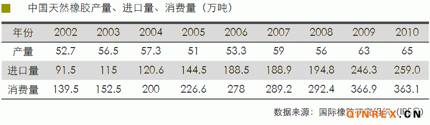 2002年起我國天然橡膠消費量超過美國,居世界第一。2010年我國天然橡膠消費量達363.1萬噸,自給率僅18%左右。隨著近年來中國逐漸成為“世界工 廠”,天然橡膠的需求量持續(xù)加大,預(yù)計今后進口天然橡膠占消費總量的比例將 進一步上升。