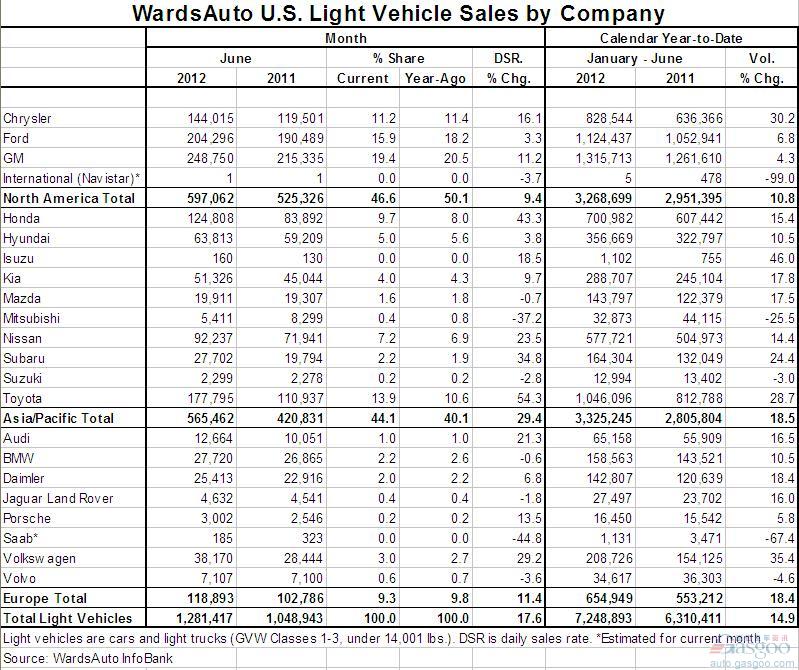 Ward's auto提供的各車企6月在美銷量數(shù)據(jù)