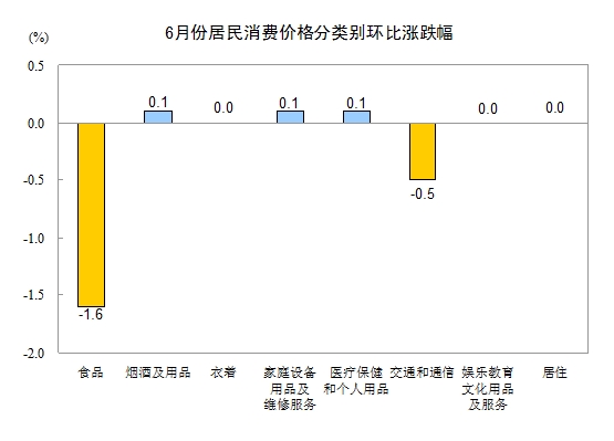 6月份,全國居民消費(fèi)價格總水平環(huán)比下降0.6%。其中,城市下降0.6%,農(nóng)村下降0.5%;食品價格下降1.6%,非食品價格持平(漲跌幅度為0);消費(fèi)品價格下降0.9%,服務(wù)項(xiàng)目價格上漲0.3%。