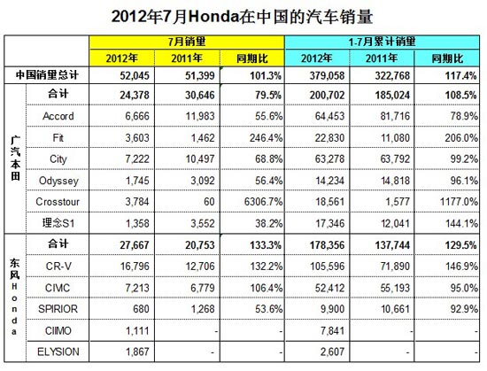 Honda于今天發布2012年7月份在中國的汽車銷量。 2012年7月Honda在中國的合資公司廣汽本田汽車有限公司和東風本田汽車有限公司共銷售汽車52,045輛,與去年同期比為101.3%。