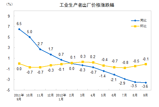 2012年9月份,全國工業生產者出廠價格同比下降3.6%,環比下降0.1%。工業生產者購進價格同比下降4.1%,環比上漲0.1%。1—9月平均,工業生產者出廠價格同比下降1.5%,工業生產者購進價格同比下降1.5%。