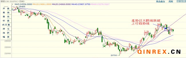 滬膠1301合約以大陰線跌破上行趨勢線,走勢整體在上行趨勢下方橫盤振蕩整理。目前的走勢在10日均線處壓力較大,如果走勢能升破該壓力線,走勢將繼續(xù)驗證上行趨勢線是否有效跌破;下方在24000關(guān)口處對期價有一定的支撐,如果跌破該支撐,則60日均線的支撐將較為明顯。預計后市滬膠1301合約整體呈振蕩偏弱的態(tài)勢,建議暫以23300--25100區(qū)間交易為宜。