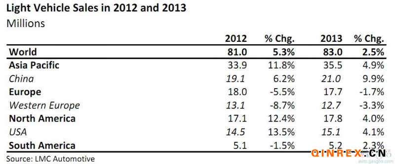 今年LMC發布的預測報告認為,2013年全球輕型車銷量將達到8,300萬輛,在2012年8,100萬輛的基礎上同比增長2.5%,去年相對于2011年的同比增幅為5.3%。