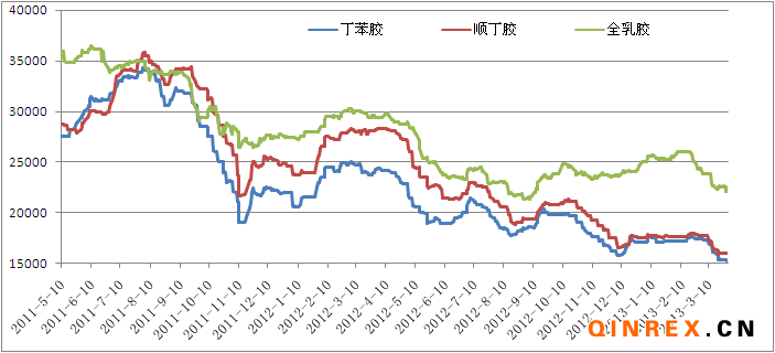 3月份合成膠延續下行趨勢,其市場的疲軟多受外圍經濟及下游采購乏力影響。近階段由塞浦路斯引發的金融危機導致歐元區經濟局勢再度陷入混沌之中,憂慮情緒蔓延,加之滬膠大幅下跌,拖累業者心態??傮w而言,合成膠供應面充足,市場基本面改觀不大,下游需求欠佳,交投清淡。