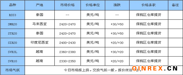 浙江地區(qū)天然橡膠市場,云南國營全乳膠市場報(bào)價(jià)在19000元/噸左右,海南國營全乳膠市場報(bào)價(jià)在18800元/噸左右,云南標(biāo)二市場報(bào)價(jià)在17700元/噸左右,越南3l含13%稅在18700元/噸左右,泰三煙片市場含17%稅在19200元/噸左右,貿(mào)易商出貨不多,下游即用即買,市場成交量有限。浙江地區(qū)順丁橡膠市場弱勢整理,零星大慶、高橋順丁報(bào)價(jià)13100-13300元/噸附近,福橡順丁在12500元/噸附近,價(jià)格僅供參考,實(shí)際一單一談。