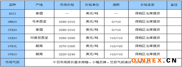 上海地區天然橡膠市場,云南國營全乳膠市場報價在17100-17200元/噸左右,海南國營全乳膠市場報價在16900-17000元/噸左右,云南標二市場報價在15800元/噸左右,越南3L含17%稅在17200-17300元/噸左右,泰三煙片含17%稅報價在17200元/噸左右,貿易商報價小幅調整,下游買入謹慎,市場成交需商談。上海地區高順順丁橡膠市場報價走低;少量大慶順丁參考價格11500元/噸附近,高橋順丁報價在11600-11700元/噸附近;報價僅供參考,實單一單一談。