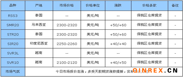 上海地區順丁市場報價偏高,多受滬膠漲停提振,部分大慶、高橋順丁報價在10600-10900元/噸左右,高端報價至11000元/噸以上,但實際參考意義不大,市場現貨稀少,實單成交確定。上海地區天然橡膠市場,云南國營全乳膠報17200元/噸;海南國營全乳膠報17100元/噸;泰國3#煙片17%稅報17300元/噸左右;越南3L膠17%稅報17100元/噸左右,13%稅報16600元/噸左右,市場報價上漲,實單商談為準。上海地區順丁市場報價繼續拉漲,較昨日上漲100-200元/噸,部分大慶、高橋順丁報價10800-11200元/噸左右,市場等待石化調價消息,觀望居多,持貨商惜售。實單成交確定。