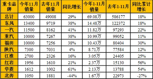 第二陣營的陜汽,今年前11月累計銷車8.71萬輛,同比增長12%。第三陣營中,江淮1-11月銷售重卡3.05萬輛,穩居行業第六,同比增長25%;上汽依維柯紅巖和華菱星馬繼續蟬聯行業增幅前兩名,分別累計銷車2.37萬輛和2.13萬輛,增幅分別為56%和54%;而包頭北奔今年前11月累計銷車1.67萬輛,比去年同期的2.30萬輛下降了27%,這也是重卡行業主流企業中唯一一家下降的企業。