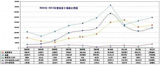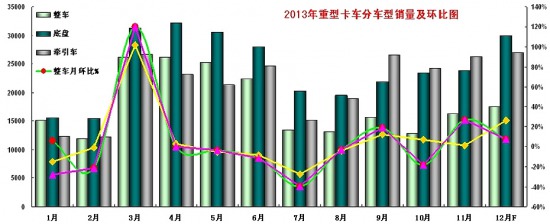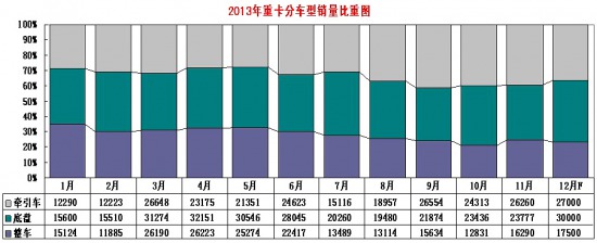 2013年前十一月,整體重型卡車市場走勢呈“S”形狀,在一月份4.3萬輛的銷量平臺上,二月份因春節因素而略有下滑。三月份開始是傳統的重卡銷售旺季,銷量一下猛沖至8.6萬輛,七月份開始回落到4.89萬輛,8月份以后再緩慢上升,進入11月和12月,重卡市再次沖量,預計12月可產銷量達到7萬輛以上。