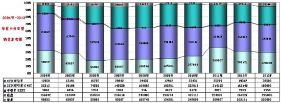 我國重型卡車在2005年的市場容量中,也只有23.66萬輛,但五年之后的2010年,重型卡車市場一下呈“井噴”的爆發性發展態勢,達到了102.5萬輛,同比增幅達到百分之六十,而成為全球重型商用車產量最大和擁有量最高的第一大國。2011年開始,重型卡車市場開始二年的回落,2013年預期重型卡車市場又開始正增長,其規??蛇_到70-75萬輛,增長率可達到20%。