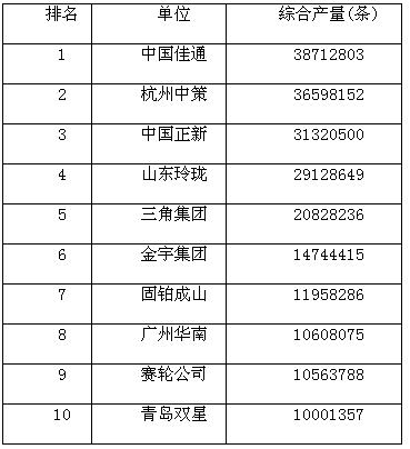 中國橡膠工業協會輪胎分會的統計數據顯示,2013年,中國產量前十的企業分別為中國佳通、杭州中策、中國正新、山東玲瓏、三角集團、金宇集團、固鉑成山、廣州華南、賽輪股份及青島雙星。