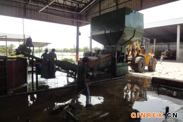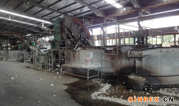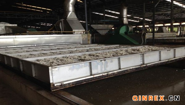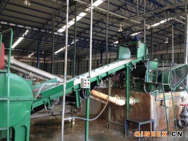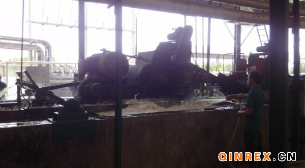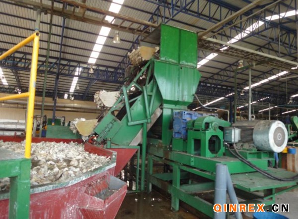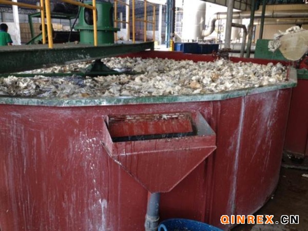 杯膠入破碎機出來的大塊生膠經簡單沖洗直接進入攪拌池進行清洗,木屑及鐵屑等雜質被過濾后進行二次破碎,破碎成小塊并再次進行清洗過濾雜質,反復破碎成并進入水池清洗。