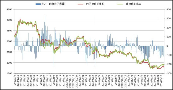 從歷史數據來看,2012年天然橡膠生產的利潤最好,生產一噸標膠的平均利潤達到了約66美元;2013年情況就有所轉變,生產一噸標膠的平均利潤約為2美元,勉強維持盈利;2014年上半年,隨著標膠價格的下跌,生產標膠的利潤轉為負值,上半年平均利潤約為-46美元/噸,出現全面虧損。