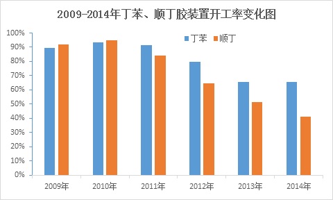 據了解,隨著產能的擴張,丁苯順丁的裝置開工率也逐漸下降。截至目前,丁苯膠裝置開工率基本維持在60%-70%之間,順丁膠裝置開工率維持在40%上下,較09-11年時的80%以上的開工率下滑明顯。產能過剩最直觀的反應就是裝置開工率的下滑。假如未來兩年丁苯順丁膠新投產裝置順利運行,產能過剩壓力將更大,界時裝置開工率還將進一步走低。