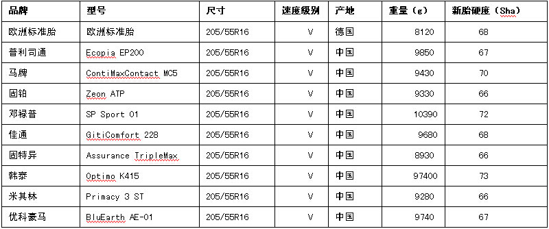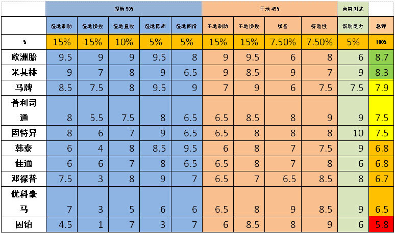 由于歐洲輪胎的滾動阻力和通過噪音未測試,為比較方便,將該兩項評分按照國產輪胎最低得分填寫