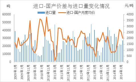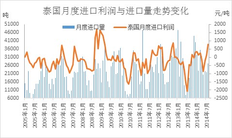 而同時我們也能看出,泰國月度進口利潤基本與乳膠進口量呈同比走勢。以今年為例,7月份之后,中國從泰國進口乳膠利潤增加,尤其在7-8月份進口利潤維持在400元/噸左右的水平,從而導致中國乳膠進口量增加。