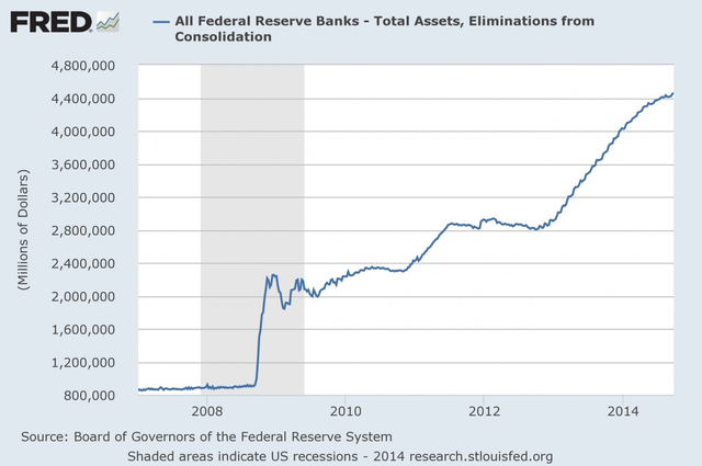 美聯儲資產負債表規模從2008年9月時候的9000億美元膨脹到了2014年10月時候的4.5萬億美元: