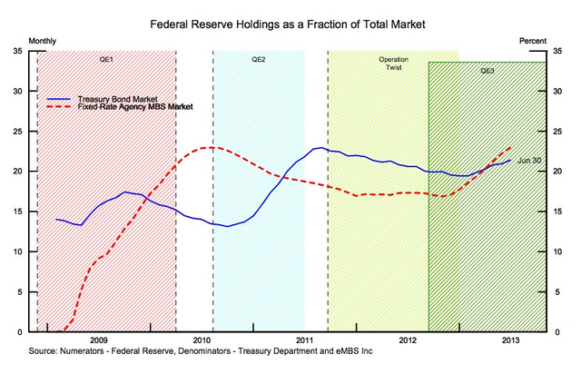 這也意味著,聯儲在它所針對的市場中扮演了極其重要的角色。到2013年的時候,聯儲在美國國債和抵押貸款擔保證券市場中均占有超過20%的份額:
