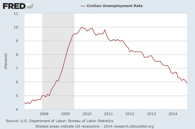 通過啟動第三輪量化寬松,時任聯儲主席的伯南克也希望通過這個項目拉低在當時高企在8.1%的失業率。失業率在那之后逐漸下降到5.9%,這被很多經濟學家視作與充分就業的目標非常接近: