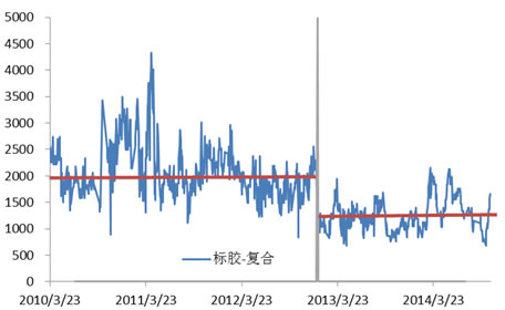 2013年天然橡膠中技術分類天然橡膠(4001.2200,通常稱為“標準膠”)關稅由“20%或2000元/噸,從低”下調至“20%或1200元/噸,從低”,復合橡膠保持零關稅,標準膠與復合橡膠的人民幣價差顯著地由圍繞2000元/噸波動下降至圍繞1200元/噸波動。標準膠與復合橡膠價差由關稅政策變動決定,波動受各自供需差異影響。