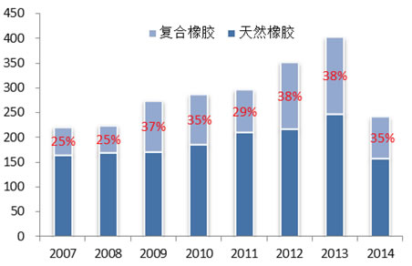 3. 近幾年天然橡膠、復合橡膠進口情況(單位:萬噸)