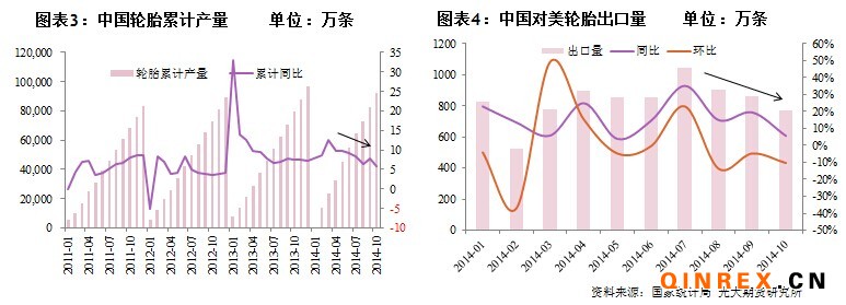 從下游需求來看,天然橡膠需求主要由中國、美國、歐洲、日本以及印度構成,其中中國的需求占比最大。不過,中國輪胎行業自2010年以來產能擴張迅速,而下游汽車制造(包含轎車、客車、載貨以及其他)新增產能增速持平。輪胎行業未來面臨產能過剩問題將越來越嚴峻。那么,輪胎行業如此多的產能是否會逐步釋放并為膠價提供支撐呢?很遺憾,從實際輪胎產量來看,與快速增長的產能不同,我國輪胎產量保持在5-10%之間的增速;且今年以來,累計同比增速一直持緩慢下降的態勢。此外,以中國最大的對外出口地美國為例,盡管今年輪胎出口同比增速持續保持正增長,但受美“雙反”影響,自7月份達到高位后,同比增速逐漸下降,11月的環比增速已轉為負值。由此可見,天然橡膠產業鏈要走出熊市,路途仍遙遠。