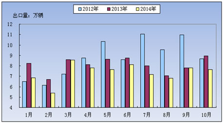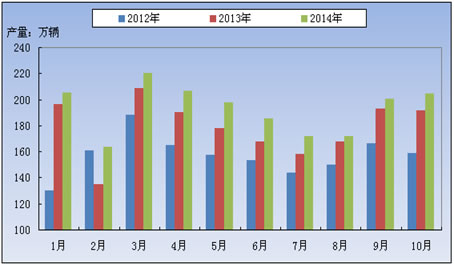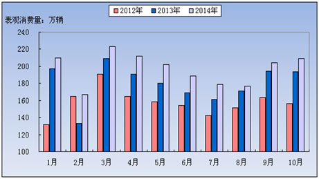 14年10月份汽車表觀消費(fèi)量為208.91 萬輛,環(huán)比延續(xù)增長,進(jìn)入年末銷售旺季,國內(nèi)消費(fèi)量提升,車企產(chǎn)量有所提升,進(jìn)口汽車數(shù)量也出現(xiàn)增長,但是出口情況卻比較慘淡,環(huán)比和同比都出現(xiàn)下滑,促使表觀消費(fèi)量出現(xiàn)較大幅度上揚(yáng)。