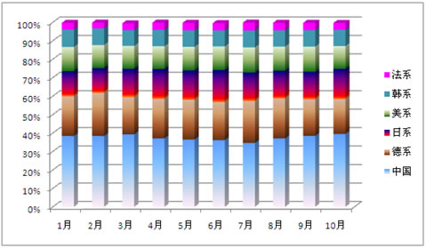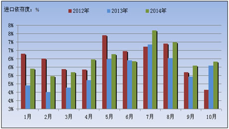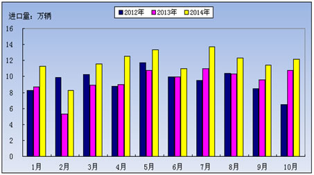 14年10月份汽車進(jìn)口依存度為5.818% ,較9月份環(huán)比小幅提升,雖然進(jìn)口數(shù)量有所提升,但是表觀消費(fèi)量也出現(xiàn)明顯的增長,因此進(jìn)口依存度小幅上揚(yáng)。隨著年末份銷售情況的向好,國內(nèi)市場需求增多,加上庫存消化,預(yù)計(jì)11月份進(jìn)口依存度仍有穩(wěn)中小幅提升的可能。