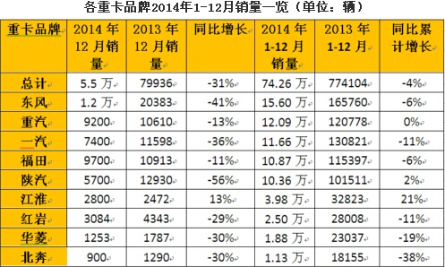 總結2014年,重卡市場基本在“前高后低”中度過,全年累計銷售74.26萬輛,同比下降4%;但市場格局相比2013年底有一定變化。其中,東風依舊是NO.1,2014年以15.60萬輛(下降6%)穩居行業第一;中國重汽超過一汽,躍居第二(2013年底為行業第三),2014年銷售重卡12.09萬輛,同比持平;一汽銷售重卡11.66萬輛,同比下降11%。第四名福田與一汽的差距不到1萬輛,其2014年銷量為10.87萬輛,同比下降6%。陜汽和江淮是主流企業中同 比正增長的兩家,分別銷售重卡10.36萬輛和3.98萬輛,增幅為2%和21%。紅巖、華菱和北奔2014年全年銷車2.50萬、1.88萬和1.13 萬輛,分別同比下降11%、19%和38%。(第一商用車)