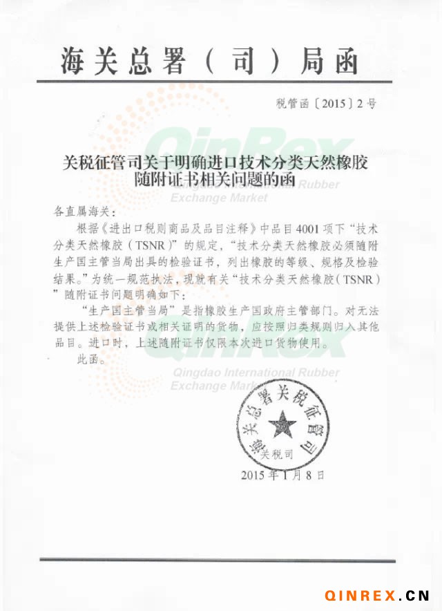 中國橡膠信息貿易網獲悉(1月20日),海關總署于2015年1月8日頒發了關于《關稅征管司關于明確進口技術分類天然橡膠隨附證書相關問題的函》,明確“技術分類天然橡膠必須隨附生產國主管當局出具的檢驗證書,列出橡膠的等級、規格及檢驗結果。”