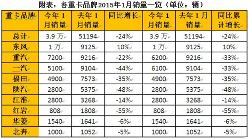 2015年重卡市場的開局,如預(yù)期般迎來嚴(yán)寒。最新獲悉,重卡市場1月份共計(jì)銷車3.9萬輛,比去年同期的51194輛大幅下降24%,環(huán)比去年12月(56363輛)也大幅下降31%。