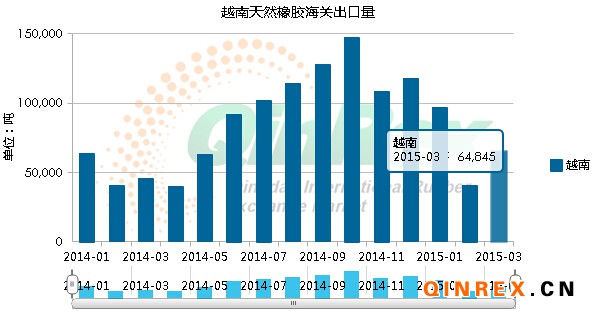 QinRex據越南4月16日消息,越南海關最新公布的數據顯示,越南2015年3月橡膠出口量為64,845噸,較2月增加58%。