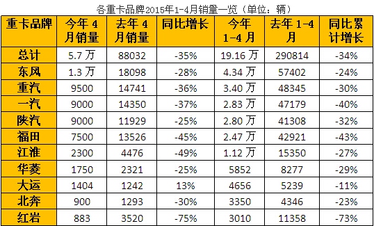 累計來看,1-4月,國內重卡 市場銷售19.16萬輛,同比下降34%。其中,東風繼續穩居第一,累計銷售重卡4.34萬輛,同比下降24%,比行業總體情況要好一些;第二名重汽累計 銷售重卡3.40萬輛,同比下降30%;一汽銷車2.83萬輛,同比下滑40%;陜汽和福田分別累計銷售2.80萬輛和2.47萬輛,同比下降32%和 43%。江淮重卡累計銷車1.12萬輛,同比下降27%,降幅低于行業平均降幅;華菱、北奔和紅巖累計銷車5852輛、3350輛和3010輛,同比降幅 為29%、23%和73%。第八名大運重卡累計銷售4656輛,同比下降11%,是前十名企業中下降幅度最小的。