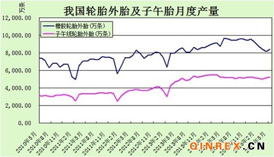圖5、2014年5月國內輪胎外胎及子午胎月度產量繼續小幅回落