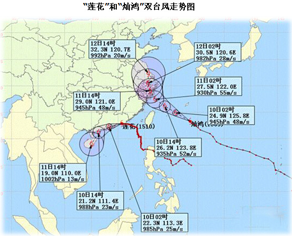 核心提示:今年第10號臺風(fēng)蓮花9日登陸廣東。第9號臺風(fēng)燦鴻直撲浙閩沿海,氣象部門預(yù)計將于10日夜間至11日上午登陸福建福鼎到浙江象山一帶沿海。受雙臺風(fēng)影響,10日至13日,福建、上海、江蘇大部等地將先后出現(xiàn)大到暴雨,臺灣、