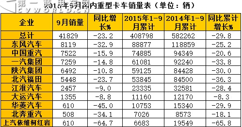 2015年9月,國內(nèi)重型卡車 (含非完整車輛和半掛牽引車)共計銷售41829輛,同比下降23.2%,月度降幅有所縮窄(8月份降幅為28.9%);1-9月累計銷量為408798 輛,累計下降29.8%,降幅縮至30%以內(nèi)。其中,東風(fēng)汽車公司9月份銷售重型卡車8119輛,同比下降32.9%,1-9月累計銷售重型卡車 88877輛,繼續(xù)排名第一,累計降幅為25.2%;第二名中國重汽今年1-9月累計銷售重型卡車74885輛,累計下降20.6%;第三名一汽集團累計 銷售61081輛,累計下降33.8%;第四名陜汽集團累計銷售59125輛,累計下降30%;第五名北汽福田累計銷售53845輛,累計下降 36.3%。