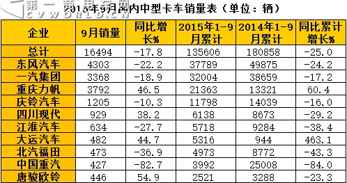 中卡市場方面,2015年9 月,國內(nèi)中型卡車(含非完整車輛)共計銷售16494輛,同比下降17.8%,月度銷量降幅再度擴大(8月份下降16.9%、7月份下降 15.7%);1-9月累計銷量為135606輛,累計下降25%。其中,東風(fēng)汽車公司9月份銷售中型卡車4303輛,同比下降22.2%,1-9月累計 銷售中型卡車37789輛,累計降幅為24.2%,繼續(xù)排名第一;第二名一汽集團今年1-9月累計銷售中型卡車32004輛,累計下降17.2%;第三名 重慶力帆累計銷售21363輛,累計增長60.4%。