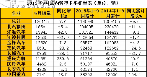 2015年9月,國內(nèi)輕型卡車(含非完整車輛)產(chǎn)量為120518輛,同比增長9.05%;1-9月累計產(chǎn)量為1145126輛,累計下降8.7%。