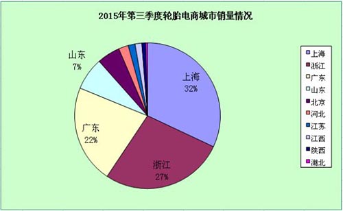 2015年第三季度,輪胎電商地域格局繼續趨向多樣化,電商領域“霸主”上海輪胎電商銷量相比上半年有所下降,僅占32%,浙江、廣東輪胎線上銷量奮力直追,直逼上海,分別占據27%和22%。其他省市如江蘇、江西等地電商也發展迅猛,試圖在輪胎電商市場“分多一杯羹”,由此可見,未來,輪胎電商的的區域競爭勢必更加激烈。