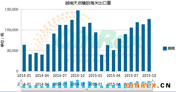 QinRex據越南11月16日消息,越南海關最新公布的數據顯示,越南2015年10月橡膠出口量為126,466噸,較9月增加11.7%,同比降14.1%。