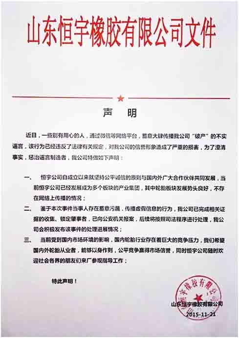 11月21日,山東恒宇橡膠有限公司發(fā)表一份聲明,就外界流傳的“破產(chǎn)”傳言予以反擊。