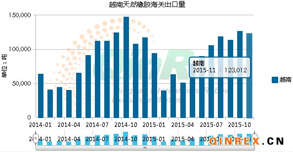 QinRex據越南12月15日消息,越南海關最新公布的數據顯示,越南2015年11月橡膠出口量為123,012噸,同比增13.9%,環(huán)比降2.7%。